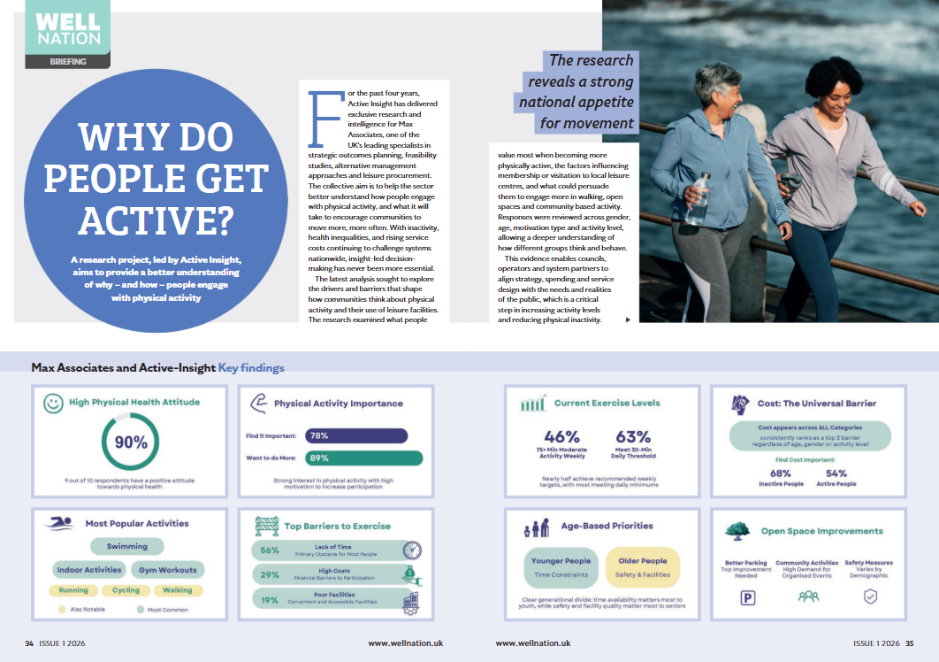 For the past four years, Active Insight has delivered exclusive research and intelligence for Max Associates, focusing on strategic outcomes planning, alternative management approaches and leisure procurement. The latest analysis was designed to help councils, operators and system partners better understand how communities engage with physical activity and how participation can be increased amid rising inactivity, health inequalities and service costs.